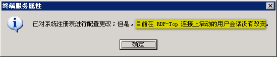 8、提示“已對系統(tǒng)注冊表進(jìn)行配置更改;但是,目前在RDP-Tcp連接上活動(dòng)的用戶會(huì)話沒有改變”,所以,需要注銷登錄,重新再登錄一次。