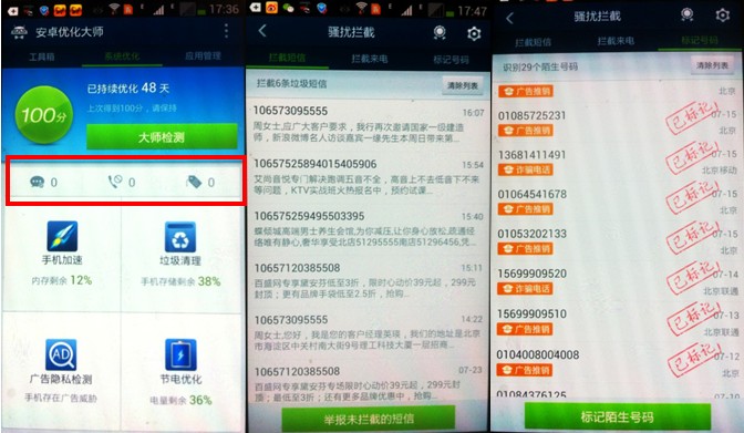 行業(yè)專家建議,安裝手機管理軟件能有效杜絕這種現(xiàn)象的發(fā)生,如安卓優(yōu)化大師等市場上的主流手機優(yōu)化管理軟件,都具備攔截騷擾電話、垃圾短信等功能。相關數(shù)據(jù)顯示,通過安卓優(yōu)化大師的精準攔截,手機被騷擾的概率能有效降低91%。