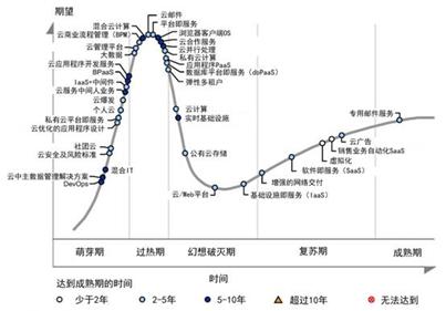 (如圖2所示)前幾年"過熱"的云計算發展現在開始趨于理性,已經度過了過熱期進入"幻想破滅期",業界不再熱衷于炒作云計算概念,而是將實現云計算的成熟和規模應用作為努力的方向。雖然媒體曝光熱度降低,期望也在降低,但這正是云計算相關產品和技術方案走下神壇,逐漸與用戶的實際應用和環境融合,從探索到應用的真正開端。