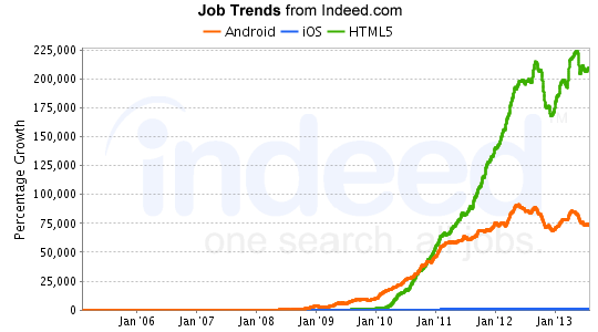 企業顯然愿意支付更多的薪水來留住人才,讓他們幫助弄清數據的價值。他們同樣也愿意給Apple相關開發者開更多的薪水:在Dice的調查中,Omnigraffle與Objective-C都出現在排行的Top10。而從Indeed.com的最熱趨勢分析中,我們能看出一些更有意思的東西:除下大數據之外的熱門技術,5個移動技能也位列Top 10——HTML5、iOS、Android、mobile app、jQuery,其中只有一個與Apple相關。