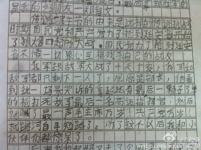 出處:2013年6月,一段講述端午節(jié)由來(lái)的小學(xué)作文內(nèi)容截圖在微博網(wǎng)友中熱傳。這篇文章,最早由新浪微博網(wǎng)友“蘇隱衡”發(fā)表于2011年11月14日。援引其中的一句話“我和小伙伴們都驚呆了”被作為網(wǎng)絡(luò)流行語(yǔ)迅速傳播,短時(shí)間內(nèi)成為了熱門(mén)話題。