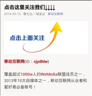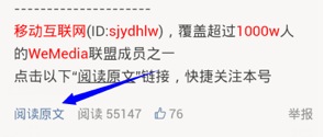 “移動互聯(lián)網(wǎng)”賬號通常也會在頁面底部提示大家點擊閱讀原文進行關(guān)注,其實也是利用這樣的方式;只是跳轉(zhuǎn)了一個頁面,比如點擊閱讀原文后跳轉(zhuǎn)到這么一個提示頁面: