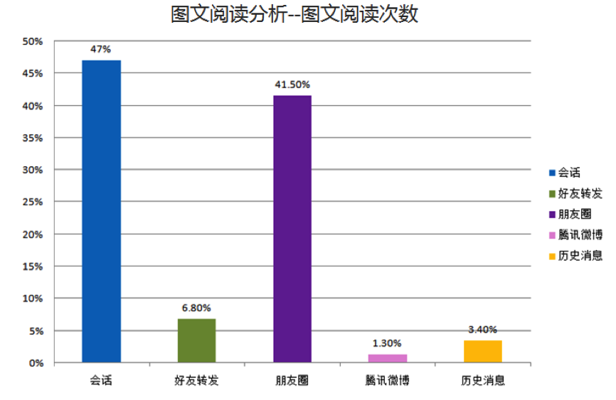 從以上兩個柱狀圖可以看出通過會話(通過公眾號下發(fā)的界面)和朋友圈,是圖文閱讀人數(shù)和次數(shù)的主要來源渠道,好友轉(zhuǎn)發(fā)和歷史消息其次,而騰訊微博轉(zhuǎn)化作用可以忽略不計(也跟賬號是否在騰訊微博宣傳和相應(yīng)微博粉絲數(shù)有關(guān))。