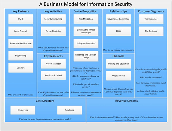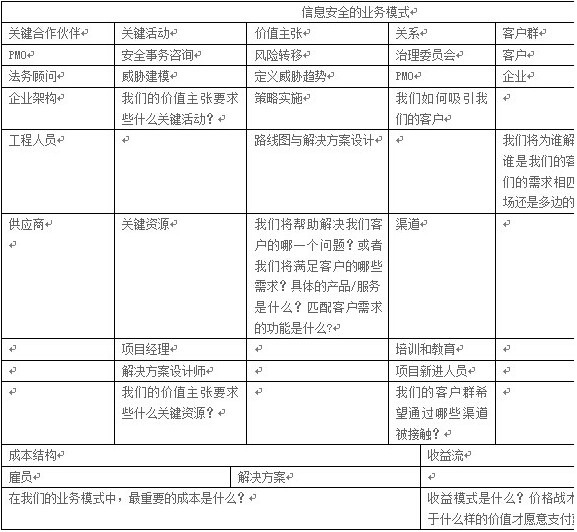 業(yè)務(wù)價(jià)值主張從本質(zhì)上來說是動(dòng)態(tài)的,而保護(hù)計(jì)劃業(yè)務(wù)模式則是相對(duì)靜態(tài)的。關(guān)鍵資源是可控因素(例如,團(tuán)隊(duì)),它提供了價(jià)值主張。關(guān)鍵合作伙伴是那些在企業(yè)內(nèi)部你希望他們提供業(yè)務(wù)驅(qū)動(dòng)因素的人。圖2顯示了一個(gè)可跨多個(gè)行業(yè)使用的安全計(jì)劃的業(yè)務(wù)模式。
