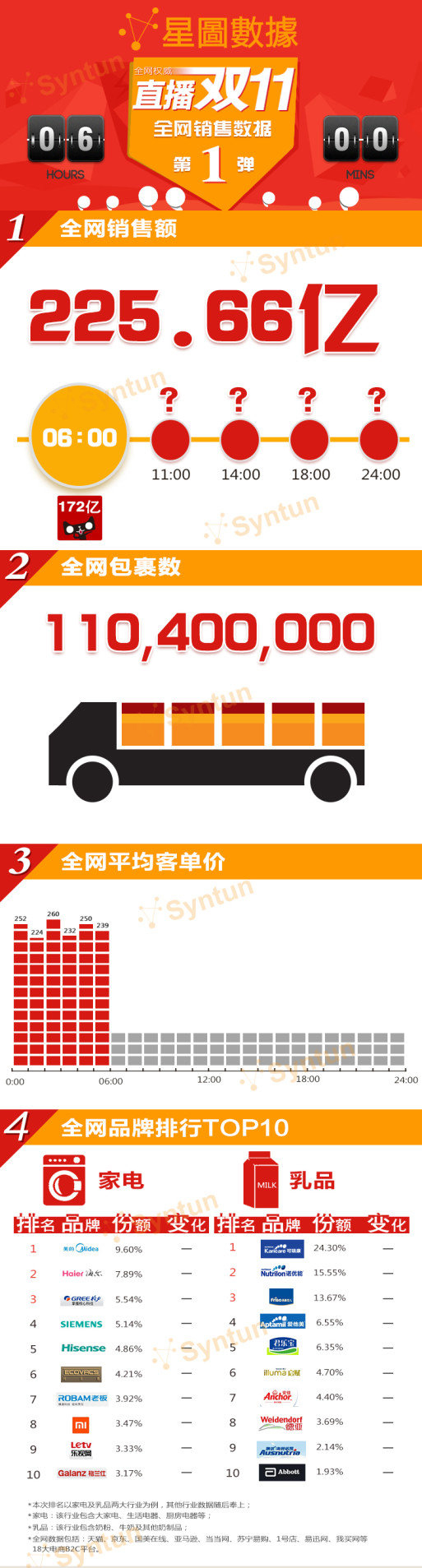 截至今天早上六點,全網(wǎng)銷售額225.66億元;全網(wǎng)已有1.1億件包裹;全網(wǎng)平均客單價約為243元;家電類品牌排行:美的獨占鰲頭啊。
