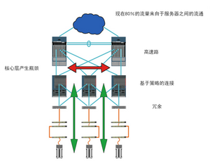 然而,應用趨勢(云計算和移動應用程序)使得在數據傳輸流量發生了改變,由于服務器之間的互動,造成80%的流量現在是來自于服務器之間的流通,在關鍵的核心層出現了瓶頸(如圖所示)。