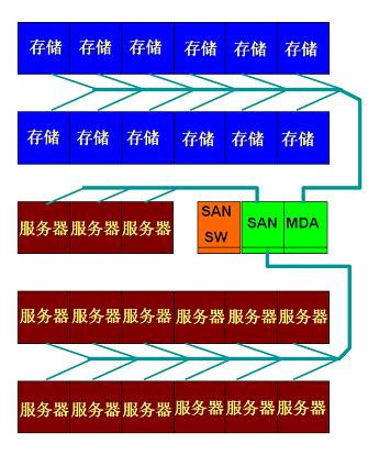 對(duì)高性能服務(wù)器的布線有兩部分組成,一部分上LAN網(wǎng)絡(luò),另一部分下行SAN存儲(chǔ)網(wǎng)絡(luò)。在實(shí)際布線方案的實(shí)施過(guò)程中,筆者有注意到有部分咨詢方在規(guī)劃布置該SAN 區(qū)域中高性能服務(wù)器,存儲(chǔ)設(shè)備與SAN交換設(shè)備這三者的時(shí)候,采用與機(jī)架式服務(wù)器類似的每列以4-8個(gè)設(shè)備柜配置一個(gè)網(wǎng)絡(luò)列頭的方式,這種方式筆者并不推薦,因?yàn)檫@樣會(huì)導(dǎo)致被分開擺放于各個(gè)列頭的SAN交換設(shè)備的布線會(huì)變得十分復(fù)雜,各個(gè)放置SAN交換設(shè)備的網(wǎng)絡(luò)列頭間為了實(shí)現(xiàn)上述多點(diǎn)對(duì)多點(diǎn)的連接方式,兩列頭間需要配置大量互連光纖。另外,如果對(duì)于高性能服務(wù)器每列設(shè)置網(wǎng)絡(luò)列頭,也并不利于SAN 網(wǎng)絡(luò)的布線,高性能服務(wù)器一部分光纖上行LAN,一部分下行SAN網(wǎng)絡(luò),如果下行SAN 部分的光纖需要經(jīng)過(guò)網(wǎng)絡(luò)列頭跳接,除了浪費(fèi)布線外,而且也會(huì)導(dǎo)致由于跳接次數(shù)太多,導(dǎo)致整體通道間的光纖損耗太多,當(dāng)前的數(shù)據(jù)中心機(jī)房建設(shè)在SAN 傳輸通道絕大多數(shù)是配置萬(wàn)兆多模光纜,例如萬(wàn)兆多模OM3光纖支持萬(wàn)兆300米的距離下要控制衰減在2.6dB 以下,如果由于整體規(guī)劃的原因使得網(wǎng)絡(luò)配線跳 接太多而導(dǎo)致整體通道過(guò)高的衰減,由于規(guī)劃不合理造成過(guò)高的衰減將是非常的可惜的,即使以預(yù)連接的方案中,也有可能導(dǎo)致衰減過(guò)高,經(jīng)過(guò)計(jì)算,每列設(shè)列頭的 SAN 區(qū)域布線方式,SAN網(wǎng)絡(luò)的整體通道連接 器有可能達(dá)到9個(gè)甚至更多的連接點(diǎn)。鑒于以上的分析,對(duì)于SAN 區(qū)域的布線網(wǎng)絡(luò),筆者更建議采用集中式的配線管理方式,配線區(qū)域放置SAN交換設(shè)備,而服務(wù)器由預(yù)連接光纜直接匯聚到配線區(qū),而不是采用上述傳統(tǒng)的列頭方式,這樣的做法通常每個(gè)通道的連接點(diǎn)可以控制在5個(gè)連接點(diǎn)以下,也更有利于實(shí)現(xiàn)該區(qū)域的配線的管理,節(jié)約用戶的布線投資,集中式 SAN 配線管理如下圖2所示。由于SAN網(wǎng)絡(luò)配線相對(duì)獨(dú)立,并不一定要將SAN 網(wǎng)絡(luò)的配線區(qū)與LAN的MDA區(qū)域放置在一起,這樣做的好處是除了減少該區(qū)域光纜的平均長(zhǎng)度外,減少布線投資,更重要的是可以減輕LAN 的MDA 配線與線槽路由的壓力,使得配線更清晰,更易管理與維護(hù)及今后的擴(kuò)展。