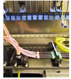 機(jī)柜內(nèi),這類布線方式是布線產(chǎn)品根據(jù)各種設(shè)備型號(hào)規(guī)格的不同設(shè)計(jì)各種安裝附件,這些附件可以方便的將這種與設(shè)備配套的布線產(chǎn)品安裝于該設(shè)備內(nèi),這樣EDA可以簡(jiǎn)單地在設(shè)備內(nèi)部集成。這種方式的優(yōu)點(diǎn)是布線便利,擴(kuò)容容易,維護(hù)方便。最大的缺點(diǎn)是由于設(shè)備型號(hào)眾多,根據(jù)設(shè)備的結(jié)構(gòu)需要有許多相應(yīng)的專用配線產(chǎn)品,受限于各廠家設(shè)備內(nèi)部空間結(jié)構(gòu)。典型的機(jī)柜內(nèi)的安裝方式如圖4 所示: