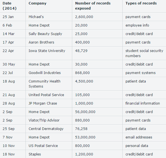 根據(jù)電子郵件收發(fā)和網(wǎng)絡(luò)安全解決方案的領(lǐng)先供應(yīng)商AppRiver,以下是美國2014年的某些主要的安全漏洞: