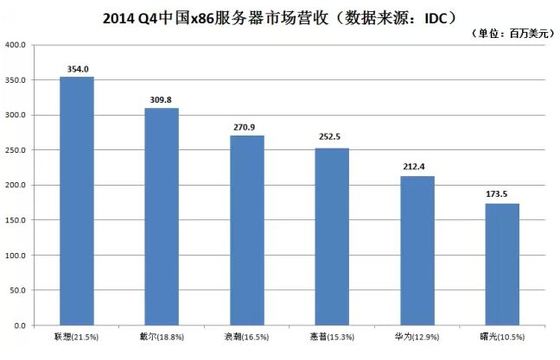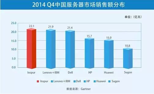 浪潮服務器官方,在3月10日發布官方信息稱:根據Gartner公司公布的最新X86服務器市場調查數據顯示,2014年第四季度中國X86服務器銷售額達到112.6億元人民幣,同比增速為24.4%,浪潮以19.5%的份額位居市場第一。2014年浪潮已經兩度獲得市場第一。