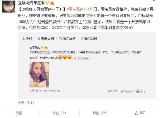 做生意70年代叫下海,10年后叫創業。2015年3月國務院總理李克強在政府工作報告中提出“互聯網+”戰略,一大波創業新軍在前在后紛紛崛起。4月20日,身在美國的網絡紅人羅玉鳳微博自曝,欲在投融界上融資千萬打造跨國美業O2O平臺。羅玉鳳想靠融資闖入炙手可熱的美業O2O,僅靠跨國平臺的噱頭夠不夠資格一戰?