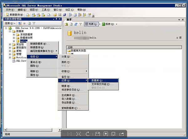1、新建一個數據庫“kelin”(本數據庫為需要還原的數據庫)。