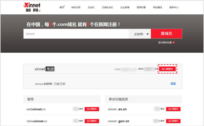 第二步:在【域名查詢結(jié)果頁】,將該域名【加入購物車】