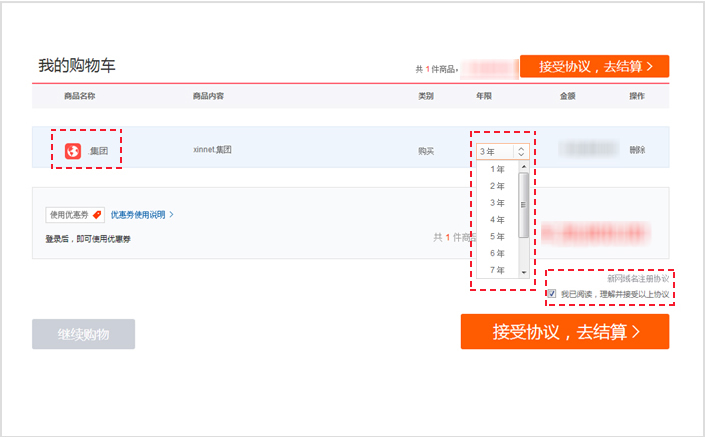 第四步:進(jìn)入【購物車】,確認(rèn)域名內(nèi)容是否正確,選擇【注冊(cè)年限】,閱讀【新網(wǎng)域名注冊(cè)協(xié)議】