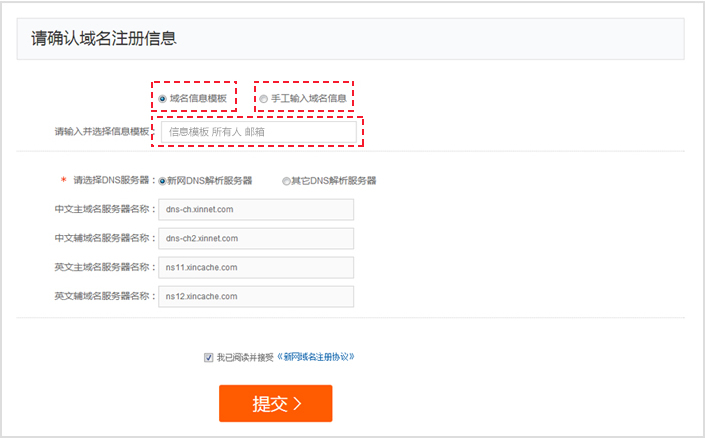第六步:填寫域名信息模板已有域名信息模板的,選擇【域名信息模板】,輸入關(guān)鍵字(信息模板名稱、所有人、郵箱)查找模板;沒有域名信息模板的,選擇【手工輸入域名信息】,填寫模板信息