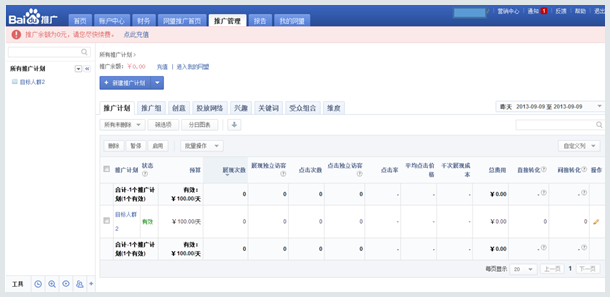 2. 推廣管理:是網盟系統的核心模塊,可進行投放設置、數據查看、推廣優化操作。其中,投放設置主要通過新建流程完成,網盟系統的賬戶結構主要分為推廣計劃、推廣組、創意,詳細知識可參見“開始推廣”;數據查看和推廣優化可在推廣計劃、推廣組、創意、投放網絡等列表中完成,詳細知識可參見“推廣優化”。