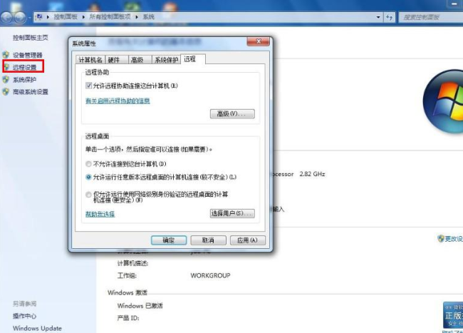 2、在打開的系統窗口右側點擊“遠程設置”按鈕,勾選“允許遠程協助連接這臺計算機”,接著在下面選擇“運行運行任意版本遠程桌面的計算機連接”,點擊確定進入下一步。如下圖: