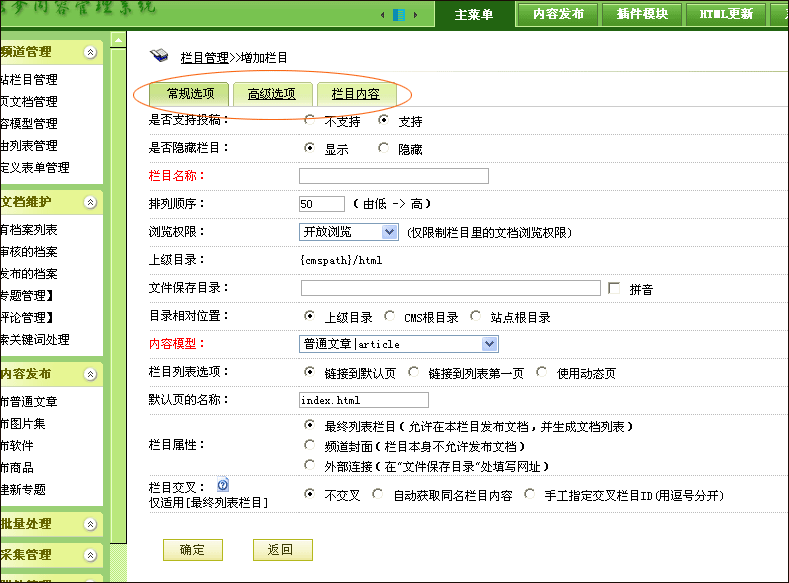 1、增加欄目時(shí)最基本的設(shè)置填寫欄目名稱和選擇欄目所屬的內(nèi)容模型,此外還需要注意文件保存目錄的選項(xiàng),內(nèi)容模型是指欄目屬于文章、圖集、下載等類型或自定義的內(nèi)容類型,文件保存目錄在沒有填寫的情況下系統(tǒng)會(huì)自動(dòng)使用欄目名稱的拼音作為欄目目錄;