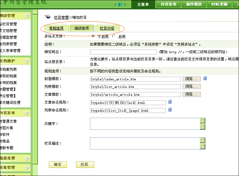 5、欄目模板、欄目生成的HTML和欄目文檔的HTML的命名規(guī)則都是可以手工指定的,可以在高級(jí)參數(shù)中填寫這個(gè)選項(xiàng)。