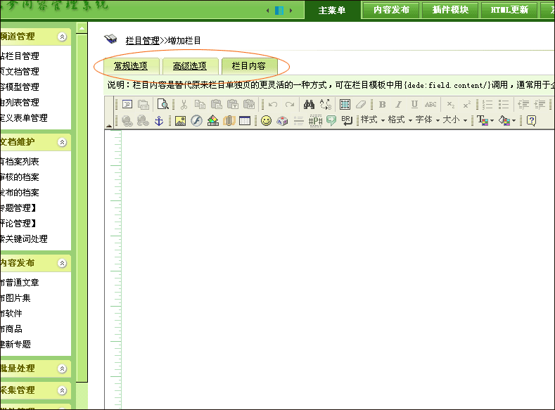 6、欄目?jī)?nèi)容,對(duì)于大多數(shù)據(jù)欄目而言,這一項(xiàng)可以不需要填寫,通常如果用于公司簡(jiǎn)介等簡(jiǎn)單頁面,可以直接在欄目里填寫內(nèi)容,欄目模板中用{dede:field.content/}調(diào)用。