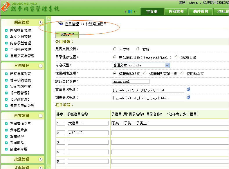 7、快速創(chuàng)建欄目--如果你不需要設(shè)置復(fù)雜的欄目參數(shù),可以用快速創(chuàng)建欄目的模式創(chuàng)建二級(jí)的欄目,當(dāng)然如果你要?jiǎng)?chuàng)建更深層次的目錄,則必須單獨(dú)創(chuàng)建。