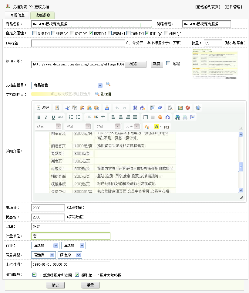 添加商品欄目,進入該欄目文檔列表,添加商品文檔信息,過程類似普通文章,如圖2。