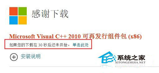 6、然后會(huì)自動(dòng)彈出下載窗口,若沒(méi)有彈出,我們可以點(diǎn)擊“如果您的下載在30秒后還未開(kāi)始,單擊此處”即可下載,下載完成后,關(guān)閉所有程序和網(wǎng)頁(yè),開(kāi)始安裝,安裝好后重啟計(jì)算機(jī)即可完美解決。