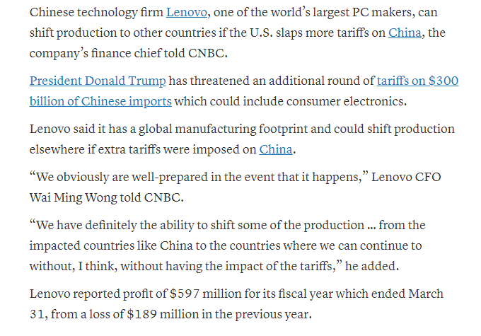 聯(lián)想表示,它在全球都擁有制造業(yè)務(wù),如果美國對(duì)中國征收額外關(guān)稅,聯(lián)想可能會(huì)將生產(chǎn)線轉(zhuǎn)移到其它地方。
