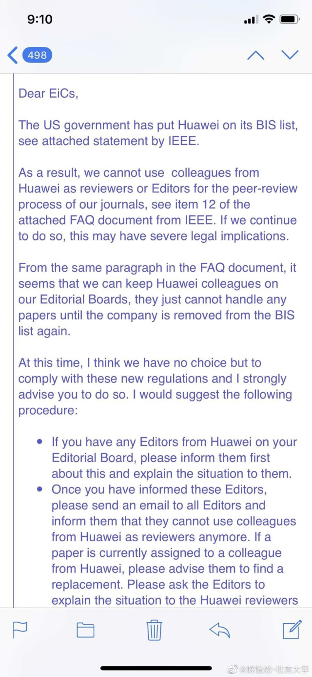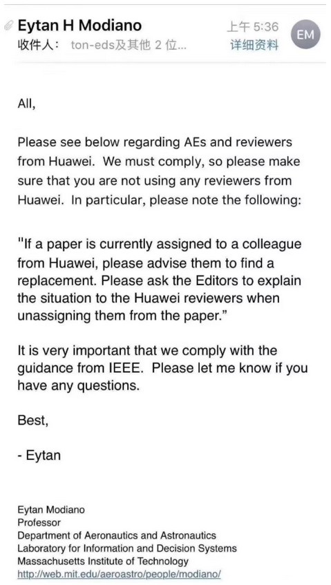 我們別無選擇,只能遵守這些新規(guī)定,強烈建議您執(zhí)行以下程序:如果您的編輯委員會中有華為的編輯,請首先通知他們,并向他們解釋情況。一旦您通知了這些編輯,請向所有編輯發(fā)送電子郵件,并告知他們不能再使用華為員工作為審稿人。如果目前有論文被分配給華為員工,請建議他們尋找替代者。請編輯向華為審核人員解釋情況。”