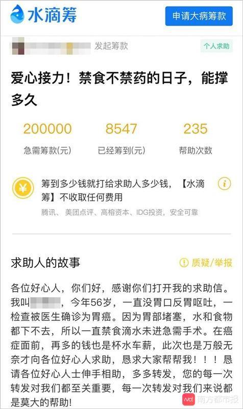 5月10日,杭州蕭山一女子通過水滴籌發(fā)起20萬元籌款,稱父親確診胃癌需要救治。很多網(wǎng)友通過轉發(fā)捐款伸出援助之手。但隨后就有網(wǎng)友發(fā)現(xiàn),該女子曬出的檢查報告單,患者并未確診胃癌,而她則在父親剛檢查完的第二天就發(fā)起了籌款。6月3日,籌款女子以“急等錢續(xù)繳醫(yī)院費用”為由,提取了8547元的善款。
