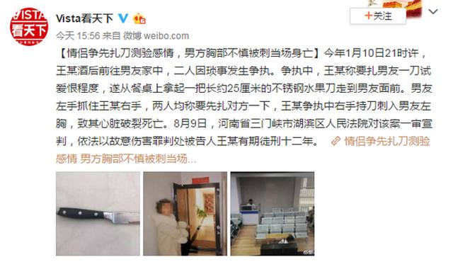 一對男女戀人因瑣事發生爭執,女子為試愛恨程度持水果刀刺中男友胸部致其心臟破裂死亡。8月9日,河南省三門峽市湖濱區人民法院對該案一審宣判,依法以故意傷害罪判處被告人王某有期徒刑十二年。