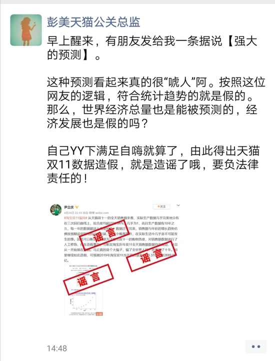 對此,天貓相關(guān)負(fù)責(zé)人回應(yīng)稱,“按照網(wǎng)友的邏輯,符合統(tǒng)計趨勢的就是假的。那么,世界經(jīng)濟(jì)總量也是能被預(yù)測的,經(jīng)濟(jì)發(fā)展也是假的嗎?自己YY下滿足自嗨就算了,由此得出天貓雙11數(shù)據(jù)造假,就是造謠了哦,要負(fù)法律責(zé)任的!”