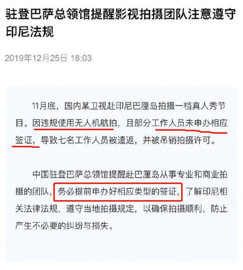 中國(guó)駐登巴薩總領(lǐng)館消息,11月底,國(guó)內(nèi)某衛(wèi)視來(lái)巴厘島拍攝一檔真人秀節(jié)目。因違規(guī)使用無(wú)人機(jī)航拍,且部分工作人員未申辦相應(yīng)簽證,導(dǎo)致七名工作人員被遣返,并被吊銷拍攝許可。此事被印尼媒體報(bào)道,造成不良影響。