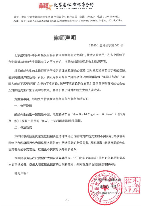 21日,郎朗工作室發布律師聲明否認其擁有美國國籍,表示郎朗的唯一國籍是中國。