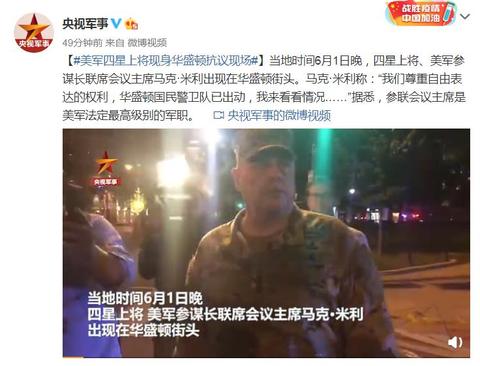 當地時間6月1日晚,四星上將、美軍參謀長聯席會議主席馬克·米勒身穿迷彩服出現在華盛頓街頭,他表示,人人都有權抗議