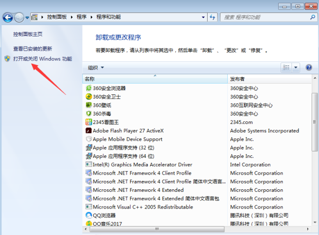 5、進入到程序和功能選項欄目,我們可以看到左上方的菜單欄中有一個打開或關閉Windows功能選項,點擊進入。