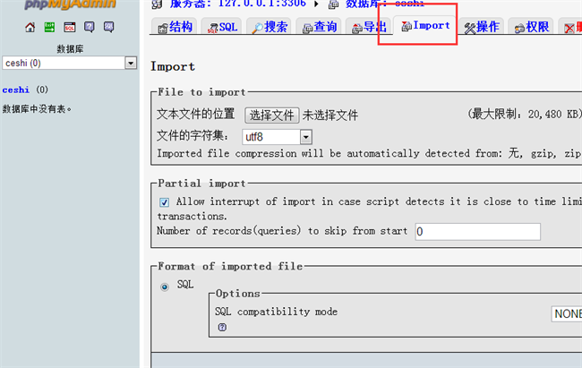 第二步,點(diǎn)擊進(jìn)入ceshi數(shù)據(jù)庫(kù),點(diǎn)擊“import”按鈕,進(jìn)入數(shù)據(jù)導(dǎo)入界面;