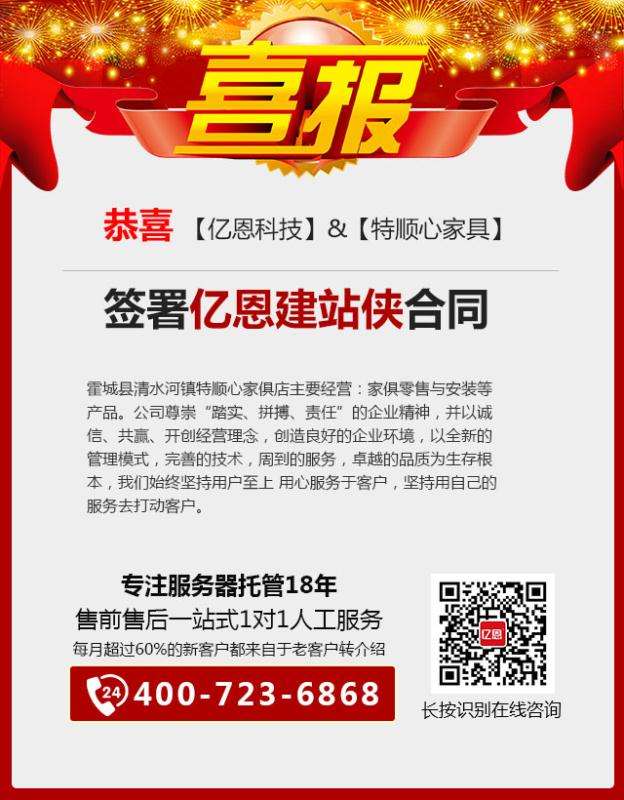 恭喜【特順心家具】&【億恩科技】簽署億恩建站俠合同。億恩科技,為特順心家具提供更專業(yè)、更高品質(zhì)的建站俠服務(wù),助力特順心家具快速發(fā)展。
