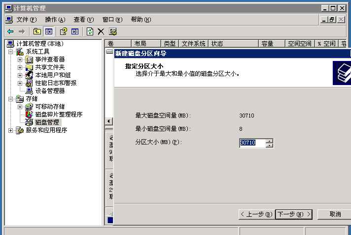 4.執(zhí)行下一步,到下圖這個界面,選擇擴展磁盤分區(qū)。空間容量自己劃定分區(qū)的大小,如果不改,默認只分一個區(qū),如圖:
