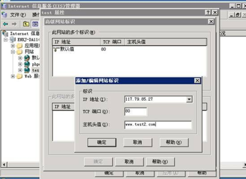 2)設(shè)置網(wǎng)站標(biāo)識,可以為您的網(wǎng)站增加多個域名綁定,如圖,選擇“高級”選項,點擊添加:輸入IP,輸入要綁定的域名,點擊確定: