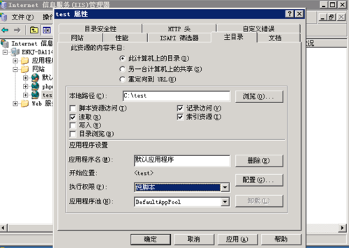 3)設(shè)置網(wǎng)站“主目錄”選項,執(zhí)行權(quán)限選擇“純腳本”:
