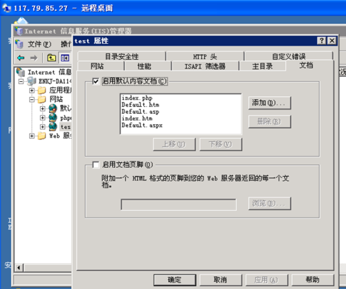 5)網(wǎng)站文檔設(shè)置:把網(wǎng)站默認(rèn)首頁文檔添加上,并上移至最頂端,點擊確定,完成: